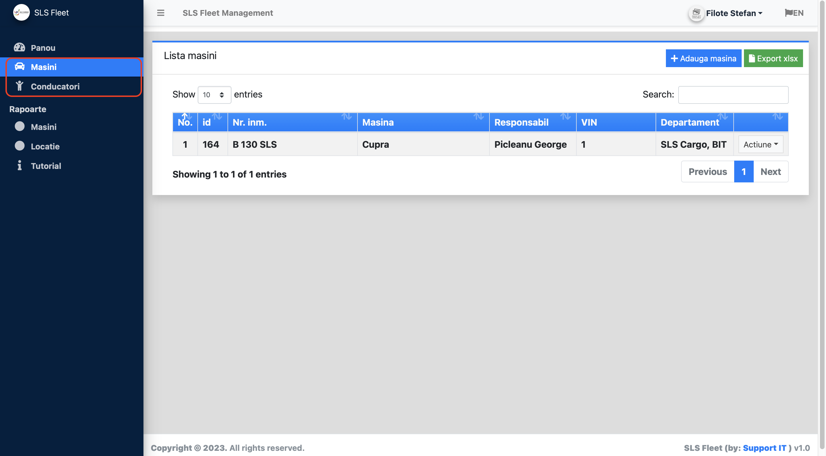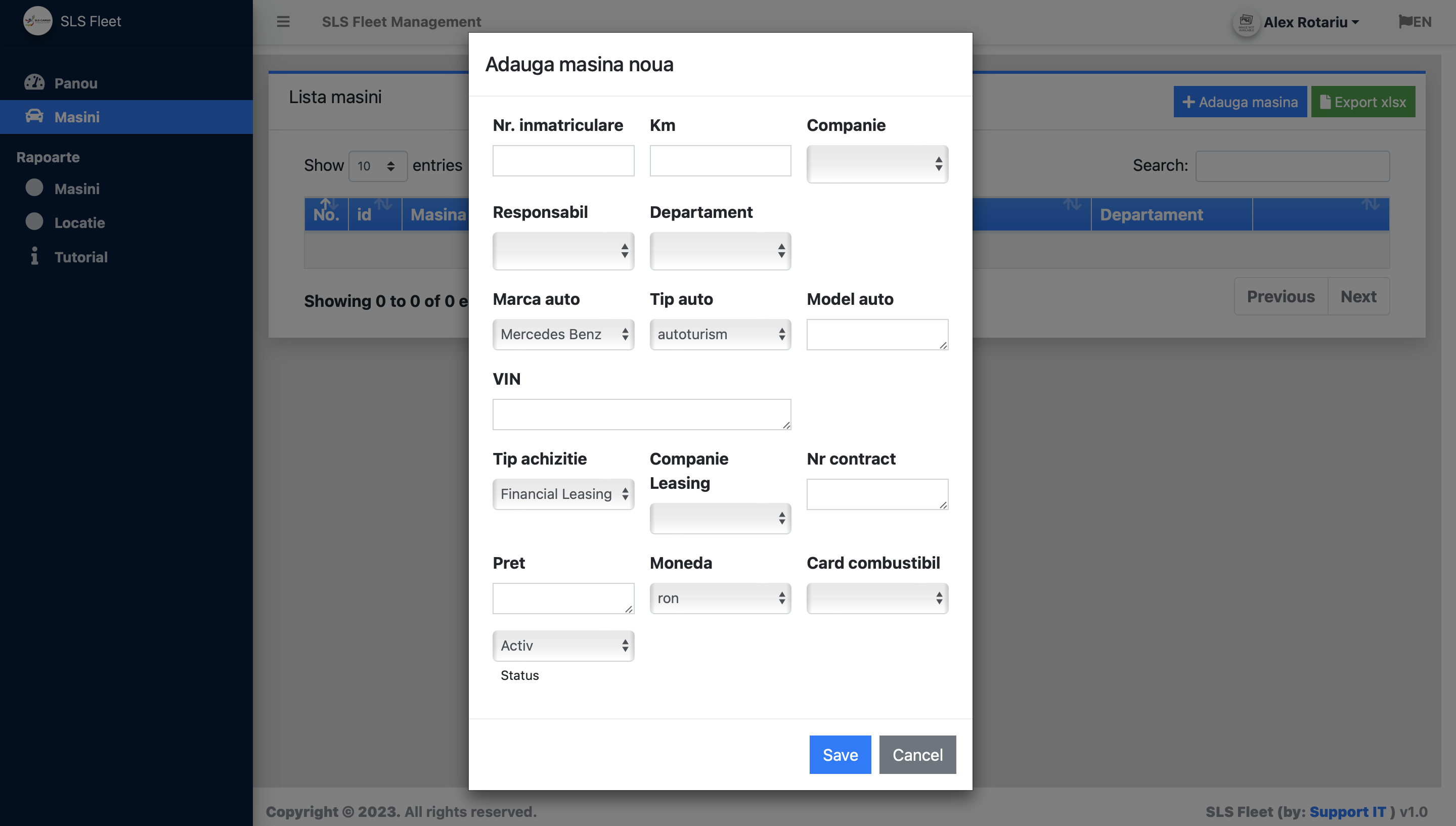 Adauga masina accesand campul 'Adauga masina', ulterior completand toate datele precum: Nr. inmatriculare, Km, Companie, Responsabil, Departament, Marca Auto, Tip Auto, Model Auto, VIN (seria de sasiu), Tip achizitie (Daca nu se stie, se alege cash), Companie Leasing (doar daca se stie), Nr. contract (doar daca se stie), Pret (doar daca se stie), card combustibil (se selecteaza NONE) Se selecteaza 'Save'.
