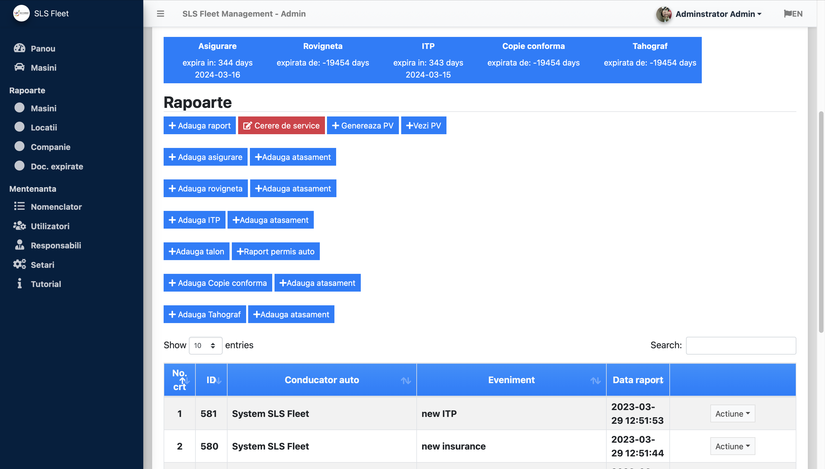 In aceasta etapa, prima etapa consta in a receptiona masina accesand 'Adauga Raport'. Se selecteaza numele conducatorului, iar tipul de eveniment este 'receptie'. Ulterior se va salva. Urmatorul pas este in a adauga asigurarea si data de expirare. Dupa caz, se poate atasa si asigurarea. Acelasi pas trebuie efectuat la ITP si Rovigneta. Se poate adauga si Talonul si Permisul de conducere al Conducatorului Auto.